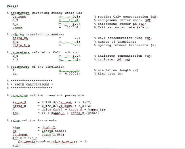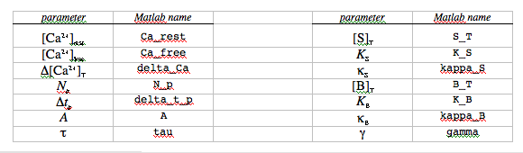 The m-file we are using implements a so-called “single compartment” model of a cell undergoing calcium fluctuations; in other words, the cell is assumed to be a single, ho-mogenous container of reagents with no spatial variation of calcium or calcium-binding molecules. Calcium enters the cell in pulses called “transients,” each of which corresponds to injection of a fixed concentration of calcium (delta[Ca2+]T) at an instant in time. When calcium enters the cell, some is bound by endogenous proteins (approximated as a single species, S, with total concentration [S]T and dissociation constant KS); some is bound by exogenous fluorescent indicator (B, with total concentration [B]T dissociation constant KB); and some remains free ([Ca2+]free). Calcium is distributed to each of these three pools such that: