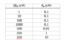 2. Dependence of dynamics on [B]T and KB. Return the m-file to the default settings. Without changing any of the other parameters, run the simulation with the following combinations of [B]T and KB: