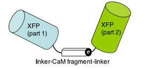 Please read the protein design work described in the 2004 PNAS article by Nagai et al. The "cameleon" protein they describe is very much like the genetically-encoded calcium sensor you will use next time. apo cameleon These proteins use fluorescence as a readout for calcium ions. The cameleon is a clever chimeric fusion protein that links the calcium responsive portion of calmodulin (as well as a portion of myosin light chain, confusingly named M13 of all things!) to a fluorescent pair. Ca2+ cameleon The cameleon's "apo" form (no Ca2+) holds the fluorescent molecules in a conformation that generates no fluorescence. When the cameleon binds Ca2+, the calmodulin domain "scrunches" and brings the two parts of the fluorescent molecule together.