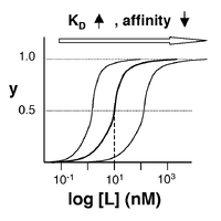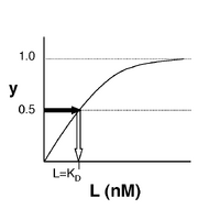 - →Then y ~ [math]\displaystyle{ L/K_D }[/math], and the binding fraction increases in a first-order fashion, directly proportional to L.
