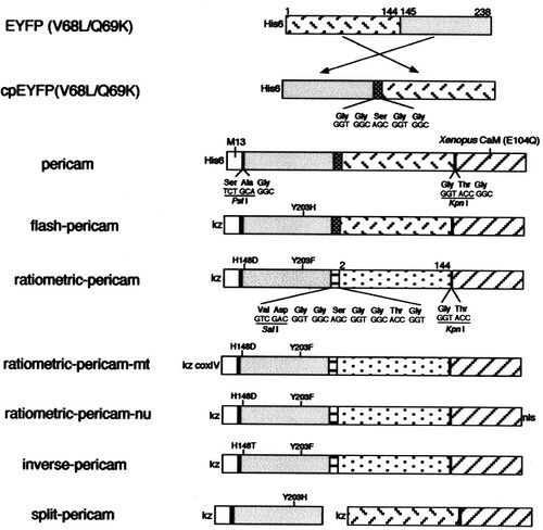 - Next, look for the two parts of the permuted EYFP, keeping in mind that each component may be separated by a short linker of a few residues. You might look for the DNA or amino acid sequence of EYFP on a site such as NCBI (choose Protein or Nucleotide in the Search pull-down menu to get an amino acid sequence or a nucleotide sequence, respectively). Note that many variants of this protein exist, but they have a lot of sequence overlap. It may help you orient yourself to know that the version of EYFP in IPC was modified at residues 68 and 69 (see beginning of Materials and Methods in Nagai et al. for details). Again, bold the first and last codon of each component, and note the numerical location.