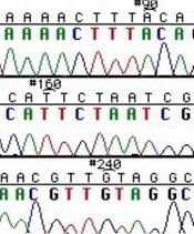 The invention of automated sequencing machines has made sequence determination a relatively fast and inexpensive endeavor. The method for sequencing DNA is not new but automation of the process is recent, developed in conjunction with the massive genome sequencing efforts of the 1990s. At the heart of sequencing reactions is chemistry worked out by Fred Sanger in the 1970s which uses dideoxynucleotides (see schematic above left). These chain-terminating bases can be added to a growing chain of DNA but cannot be further extended. Performing four reactions, each with a different chain-terminating base, generates fragments of different lengths ending at G, A, T, or C. The fragments, once separated by size, reflect the DNA’s sequence. In the “old days” (all of 10 years ago!) radioactive material was incorporated into the elongating DNA fragments so they could be visualized on X-ray film (image above center). More recently fluorescent dyes, one color linked to each dideoxy-base, have been used instead. The four colored fragments can be passed through capillaries to a computer that can read the output and trace the color intensities detected (image above right). Your sample was sequenced in this way on an ABI 3730 DNA Analyzer.