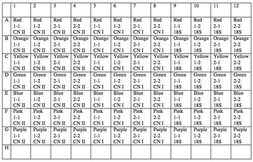 Each group will have 6 samples in duplicate, or 12 reactions in total. In the schematic below, the top row indicates the group colour (obviously!). The next row indicates the sample identity as X-Y, where X is the culture condition (keep track of what is 1 and 2) and Y is the replicate number. The final row indicates the gene of interest and thus the primer set that will be used.
