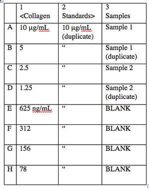 Suggested ELISA plan. This plan can be used for both your collagen I and your collagen II plate. In each case, columns 1 and 2 are duplicates of the collagen standards, and column 3 contains your experimental samples and a few wells (labeled BLANK) to measure background. - You will be given 250 μL aliquots of collagens I and II at 10 μg/mL each. Prepare your standards as follows: