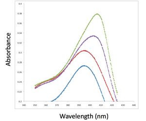 One week from now, you'll perform the aptamer-heme binding assay, so now is a good time to take a closer look at heme. Heme and similar compounds contain a large porphyrin or proto-porphyrin ring (see image above right). The functional unit of porphyrin is a pyrrole, an amine heterocycle; four pyrroles make up a porphyrin. As you may know, conjugated aromatic rings often exhibit interesting spectroscopic or fluorescent properties. Heme’s natural absorbance maximum, or Soret peak, is at about 396 nm. RNA molecules that do not bind heme do not affect the location of this maximum, though they may slightly shift the height of the entire curve. However, heme-binding aptamers shift the Soret maximum to about 405 nm, and also substantially increase the magnitude of the peak (see image above left).