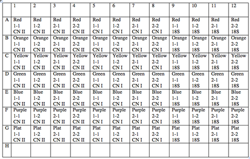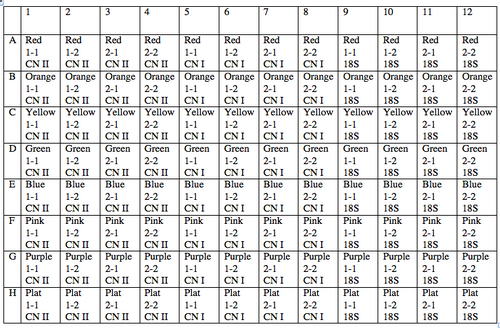 Each group will have 6 samples in duplicate, or 12 reactions in total. In the schematic below, the top row indicates the group colour (obviously!). The next row indicates the sample identity as X-Y, where X is the culture condition (keep track of what is 1 and 2) and Y is the replicate number. The final row indicates the gene of interest and thus the primer set that will be used.