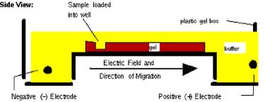 Next time, you will visualize your entire reaction mixture in a gel, and if need be excise and purify the band of the correct size (~1400 bp) to isolate it from any non-specific products that occur in spite of the above precautions. Gel electrophoresis is a technique used to separate large molecules by size using an applied electrical field and appropriate sieving matrix. DNA fragments are typically separated in gels composed of agarose, a seaweed-derived polymer (see figure, below left). To prepare these gels, molten agarose is poured into a horizontal casting tray containing a comb. Once the agarose has solidified, the comb is removed, leaving wells into which the DNA sample can be loaded. The loaded DNA samples are then pulled through the matrix when a current is applied across it. Specifically, DNA molecules are negatively charged due to their phosphate backbones, and thus travel toward the positive charge at the far end of the gel (see figure, below right).