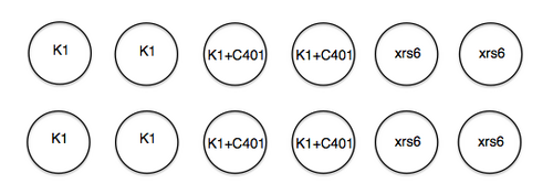 In anticipation of your lipofection experiment, the teaching faculty plated 1x105 K1 and 1.2x105 xrs6 cells per well in a 24-well dish at ~ 11 am yesterday. Half of the K1 cells then received 5 μM of DNA-PK inhibitor "C401" at ~ 5 pm yesterday. A plating schematic for your experiment is shown below. Note carefully which cells are which, including those that have been pre-treated with inhibitor.