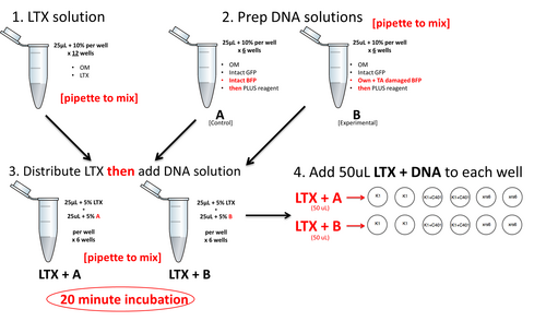 Below is a preview of the lipofection workflow. Do NOT begin these steps until you have completed the calculations further below. At each step, be sure to pipet to mix.