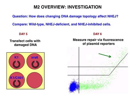 As depicted below, in Module 2 you will be concerned with measuring DNA repair, specifically through the non-homologous end-joining pathway, or NHEJ – more about that in the coming week. There are two parameters across which you will compare repair: cell type and damage topology. We will work exclusively with Chinese hamster ovary (CHO) cells; wild-type cells are called K1 while cells deficient in the NHEJ protein Ku80 are called xrs6. You will investigate DNA repair in K1 cells with and without an NHEJ inhibitor of your choice, and in xrs6. You learned in Module 1 that double-stranded DNA ends can be "sticky," or more formally "cohesive," (with overhangs) or blunt. In Module 2 we will take things up a notch and investigate about half a dozen different cut topologies: sticky, blunt, sticky on one end and blunt on the other, etc.