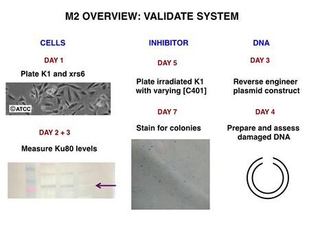 To be confident of your findings related to DNA repair, you will validate three components of your system: the deficient cells, the inhibitor function, and the damaged DNA. Briefly, you will: perform a Western protein analysis to assess Ku80 levels in K1 and xrs6 cells; quantify the ability of K1 cells to repair irradiation-induced DNA damage with and without potential inhibitors; verify that the DNA reporter was indeed cut. The validation phase is depicted below.