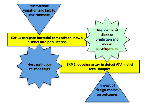 In the primary experiment, you will pool data with your peers to perform a phylogenetic analysis of the bacteria found in two distinct populations of migratory birds. You will look for similarities and differences and speculate about the mechanisms that brought these about. This study has parallels to recent investigations of human microbiome diversity that shed light on variations in metabolism, susceptibility to infection, and other measures of health. More directly, your results may suggest a link between a particular factor in a bird's environment, such as climate or diet, and characteristics of the resulting gut bacterial population, such as the dominant species or degree of variety. And hey, we'll also learn what bacteria you might be exposed to the next time you accidentally encounter bird feces!