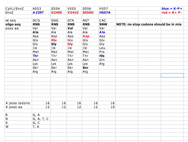06.16.09 email from Mike: As for the EnvZ mutants, here's the list we've compiled from the literature. Keep in mind that K+P- really means a shift in the balance of kinase and phosphatase activities and similarly for the K-P+ alleles. None of them is perfectly "clean" in eliminating one of the activities: