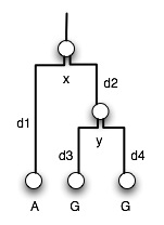 p(D|T) = p(x->A|d_1) * p(x->y|d_2) * p(y->G|d_3) * p(y->G|d_4)