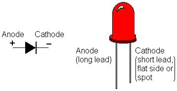 These devices work very similarly to standard semiconductor diodes, except that forward current passing through them causes light emission. LEDs that are packaged individually look similar to the figure below. The cathode (–) lead is typically shorter, and the LED package has a small flat next to that lead.