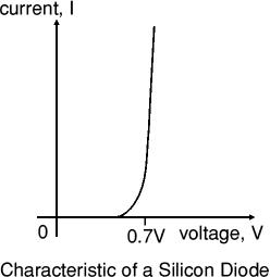 Electrons use up a little energy pushing its way through the diode, rather like a person pushing through a door with a spring. This means that there is a small voltage across a conducting diode, it is called the forward voltage drop and is about 0.7V for most diodes which are made from silicon. This forward V drop can vary for various other types of diodes, especially LEDs. The forward voltage drop of a diode is almost constant whatever the current passing through the diode so they have a very steep characteristic. So, our idealized i-v characteristic is slightly modified (note that even in the forward conducting region, the diode i-v curve has a very steep but finite slope, which means that there is a small resistance in forward bias):