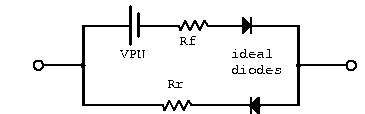 The top branch (in which current can only flow to the right) represents the forward regime, which has a finite small resistance Rf and the forward voltage drop Vpn. The lower branch is the reverse regime, with the large reverse resistance represented by Rr, and only allowing current to flow to the left.