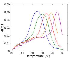 In addition, plot the derivative of each curve. Note that the differentiation operation is particularly sensitive to noise. If your derivative plots look noisy, apply better filtering to the raw data. It will be helpful to create a matlab script to process the data. Tm is taken to be the peak value of the derivative.