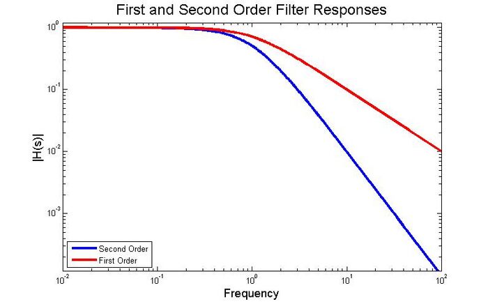 - Above the cutoff frequency, the second order transfer function falls off twice as fast as the first order — 40 dB per decade versus 20.
