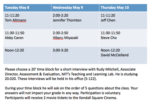If you're able, please consider participating in a short (20') interview this week with Rudy Mitchell, Associate Director, Assessment & Evaluation, MIT's Teaching and Learning Lab. He is studying 20.020.