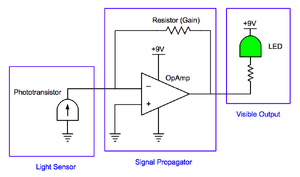 We can thus use these two devices to build a circuit that will operate similarly to our bacterial photography system: the photodiode will sense light and generate an electrical signal that will be detected by the LED which produces a color. Depending on your goals, it might be sufficient to build the circuit with the largest resistor in place for the OpAmp, since this circuit should behave identically to the bacterial photography system (i.e. the LED on in the dark and off when the flashlight is shining on the photodiode). If you'd like to explore the issue of "gain" in the signaling system, then the resistor associated with the OpAmp can be swapped out for smaller ones, and the system can be observed to behave less digitally since the gain will be proportional to the resistance.The instructions for this build are here.