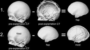 PMMA implants, based on computer-designed molds, were implanted into twenty-eight patients--11 female, 17 male--between 2009 and 2012. The molding of the implant occurred during surgery, so that a CT scan of the patient's open skull could be used to engineer the necessary shape (see figure right). Results of the procedure were assessed using a questionnaire and quantitative geometric analysis of the implant [17].