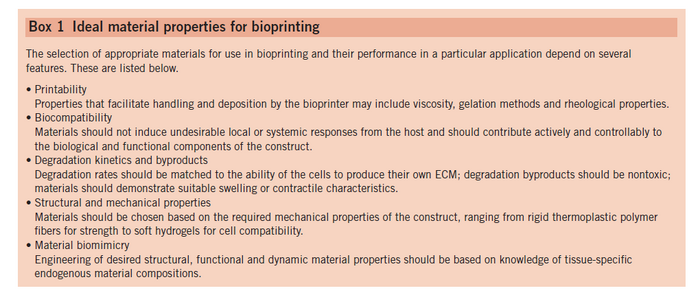 The selection of bioink material is an important consideration when planning to bioprint a tissue model; materials must be suitable for crosslinking in order to facilitate bioprinter deposition and shape retention, as well as biocompatible for long-term transplantation goals. The table below outlines each of the key considerations in preparing an ideal bioink. There are countless possible biomaterials suitable for bioprinting including poly(ethylene glycol) (PEG), polylactic acid (PLA), polyglycolic acid (PGA), poly(lactic-co-glycolic) acid (PLGA) and gellan gum. The choice of material is dependent upon desired cell type and mechanical properties of the tissue being mimicked.