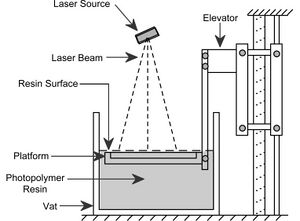 Traditional 3D printing, called stereolithography, was invented in 1984 by Charles W. Hull. His patented technique utilizes a UV activated liquid polymer that hardens when exposed to ultraviolet light. In his method, thin layers of polymer are sequentially hardened, one on top of the other, to form a solid 3D structure with instructions from computer aided design (CAD) programs. The platform upon which the object is built is lowered deeper into the liquid polymer after each layer is solidified, allowing for new layers to be constructed on top of old ones (as shown in the diagram), resulting in a 3D object. More recent 3D bioprinting techniques have borrowed this method to allowed direct printing of biomaterials into 3D scaffolds that may be used for transplantation or tissue modeling.