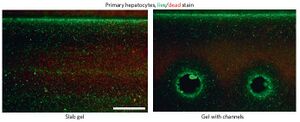 Alginate microfilaments were shown to print uniformly and continuously and diffusion tests performed with macromolecules demonstrated that the structure has viable nutrient permeability properties. A cuboid structure was later created with overlapping microchannels. Scanning electron microscopy (SEM) confirmed that the overlapping microchannels fused and become an interconnected vascular network. Viability of cells within this structure was analyzed one day after fabrication under a confocal microscope. As can be seen in the figure below, cell viability was very high in the areas surrounding the microchannels furthering endorsing the potential of this novel procedure. Future studies suggested for this method include seeding the cell culture with stem cells and consideration of various physiological stresses [16].