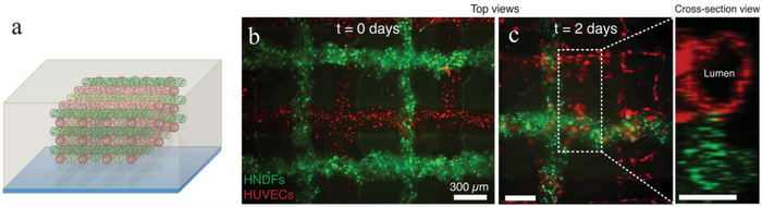 Researchers at Wyss Institute for Biologically Inspired Engineering at Harvard University and the Harvard School of Engineering and Applied Sciences (SEAS), created a 3D bioprinting method that able to print different cells and materials at once, while fabricating embedded vasculature. The team was able to print an organ foundation from bioink consisting of gelation methacrylate seeded with fibroblasts and a fugitive ink [8]. The fugitive ink used in this study is a novel aqueous solution containing Pluronic F127, a unique copolymer that becomes more soluble in water as it is cooled and displays similar viscoelastic properties to typical bioink under normal bioprinting conditions. This copolymer is comprised of two hydrophilic polymers sandwiching a hydrophobic polymer. As temperature is decreased, copolymers coagulate to form hydrophilic micelles with dense hydrophobic cores; at 4 C, the gel experiences a dramatic drop in viscoelastic force and is easily removed from the system [8]. In their method, four separate ink reservoirs were used along with four pneumatic extruding print heads. Different nozzle types were used, including borosilicate and tapered plastic. To produce the full construct, each layer was printed separately, after which the fugitive ink was removed and the vascular network was seeded with endothelial cells. The vascularized structure was analyzed over the course of one week in order to investigate both the effectiveness of vascularization and the viability of the cell culture. After 2 days endothelial cell growth in the vascular networks become apparent, as can be seen in the figure below. Cell viability was reported to increase from 61% on the day of fabrication to 82% on day 7, providing evidence for cell proliferation and survival implying adequate nutrient and waste diffusion [8].
