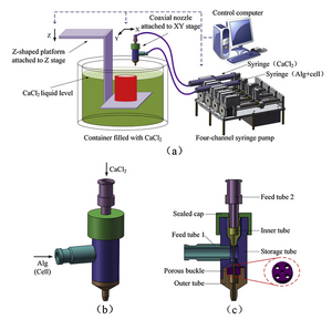 Gao et al. have proposed a novel bioprinting technique in which cell culture is printed simultaneously with hollow sodium alginate channels. The bioprinter utilizes a dual-feed syringe pump with a coaxial nozzle consisting of an inner and outer tube. Alginate and cell solution are feed to the outer tube, surrounding a feed of calcium chloride in the inner tube. The system prints onto a platform suspended in a calcium chloride bath that descends deeper into the bath with each successive layer. The sodium alginate undergoes a crosslinking reaction upon exposure to calcium chloride, resulting in a hardened, hollow microchannel. A schematic of the apparatus is shown in the image to the right [16].