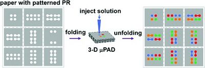 While stacking was a reasonable method for creating the 3D µPADs, origami method is beneficial because it does not need any adhesive at all. This removes any chance of additional contamination and need for laser cutting.[9] The layers have the desired patterns printed into the paper using photolithography with indicators for where the paper should be folded. The patterns control the flow of the fluid to avoid leaking, without additional energy needed.[10] The folds were held into place using a clamp or weight to keep the material in place.[8]