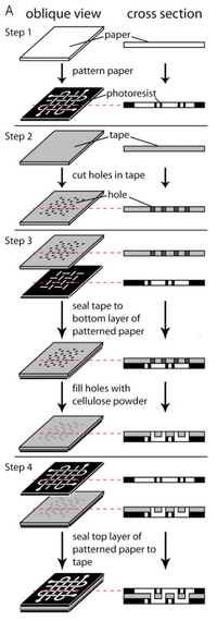 The process of stacking can be implemented by creating multiple paper layers and then connecting them together through the use of double sided adhesive tape. The adhesive tape is lined up between each layer to connect the paper without blocking the passages for fluid flow.[8] The connecting tape can be cut using a laser cutter to create channels that would be filled with cellulose powder to link the fluid routes creating multiple hydrophilic paths. The cellulose powder is necessary to fill the gap that was created by the tape to induce flow between the paper layers. In this method of adhesive stacking it has been found that the paper and tape can be difficult to align and therefore other stacking methods have been investigated.