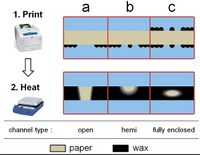 Another alternative method is to create a 3D microchannel on a single piece of paper using wax patterning, wherein wax is strategically melted into paper to create channels. This has the advantage of decreasing the risk of contamination, and also takes advantage of the properties of wax. Wax is hydrophobic, and thus, this patterning method can be used to create specific hydrophilic channels of unwaxed paper. The wax is melted into the paper in this method, and channel dimensions can be manipulated by strategically choosing the quantity and location of molten wax, as shown in Figure 2.[7]