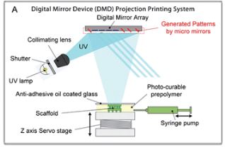 Digital Micromirror Device-based Projection Printing (DMD-PP) is another type of 3D printing technology. It is a projection system that uses a controllable digital mirror to reflect laser light in an entire plane which then allows the curing of an entire layer at a time. (Figure 2) Compared to SLA system the DMD-PP the building structure is bottom-up different from the SLA which requires the stage to move as well as the laser. An example of microfluidic device created using the DMD-PP is the 3D in vitro microchip which is made of hydrogel with a honeycomb structure which allows the microchip to mimic the 3D vascular morphology of an in vivo micro environment.
