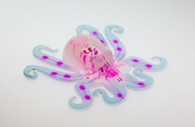 The Octobot is a 3-D printed microfluidic robot that is fully autonomous. The robot is made completely of soft materials, such as polydimethylsiloxane (PDMS), Pluronic F127, and SE 1700 and Sylgard 184, which are silicone-based materials. The Octobot is powered by a microfluidic logic controller and a decomposition reaction that generates gas.[14]