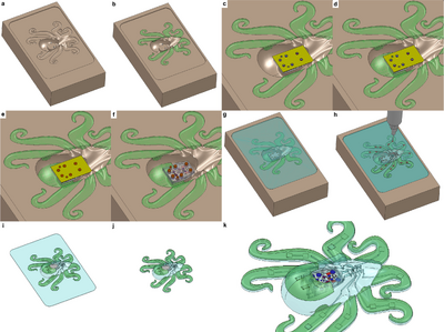 Several different techniques are used to produce the Octobot. The body of soft lithography and micro-moulding and embedded 3-D (EMB3-D) printing. The printing process can be seen in the figure below.