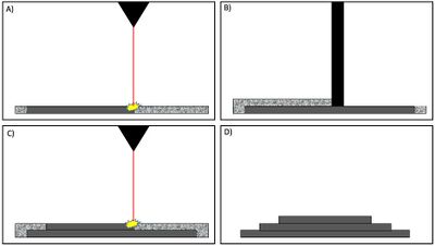 In contrast to extrusion printing where the printed material is extruded from a moving tip, this method involves using a bed of a powdered material and fusing together a layer of that material in a specific shape using a laser. After adding another layer of the powder, it can then be fused on top of the previous layer, almost like a reverse CNC milling process in that an object is constructed by fusing powder together instead of shaving material off a starting block. Although this allows for a very high resolution, one drawback to this approach is that the powder must be removed after the manufacturing process. For the scale of the small capillaries that microfluidics research necessitates, this makes this method somewhat unsuited to microfluidics channels [9]. Using CO2 laser machining of polymethyl methacrylate (PMMA) Romoli et al. were able to adopt the technique to create 3D structures by printing several PMMA sheets and then bonding them together [10].