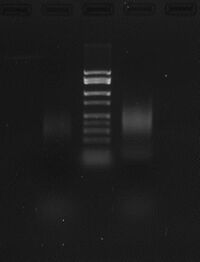 1) 1 uL DNA template, 2) 2 uL 100 bp low scale ladder, 3) 5 uL PCR product