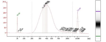 - Quant DNA library using PicoGreen and run (<3 ng/uL) on BioAnalyzer DNA High Sensitivity Chip