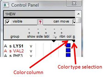 On the Control Panel, notice that, next to the column heading "col", there are the letters BS. This indicates that coloring commands will change backbone and sidechain displays only. Now pull down the Color menu, and notice that the first line brings down a submenu of "act on" commands. This submenu determines which display elements (backbone, sidechain, ribbon, and so forth) will be changed by subsequent Color-menu commands. (On Macintosh, this submenu is also located below the col heading of the Control Panel. Find it by clicking the small black triangle below col.) | On the Control Panel, notice that, next to the column heading "col", there are the letters BS. This indicates that coloring commands will change backbone and sidechain displays only. Now pull down the Color menu, and notice that the first line brings down a submenu of "act on" commands. This submenu determines which display elements (backbone, sidechain, ribbon, and so forth) will be changed by subsequent Color-menu commands. (On Macintosh, this submenu is also located below the col heading of the Control Panel. Find it by clicking the small black triangle below col.) | ||