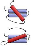=<center> | '''At left''': A ''de novo'' designed switch protein. The lever arm helix (red) packs across the scaffold helices (blue). | ||