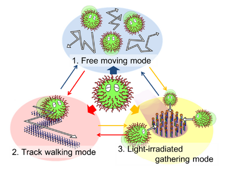 | | |To realize functional autonomous molecular robot, the robot needs to be able to move at all times because it guarantees the molecular robot not to stop and become uncontrollable. Furthermore, this characteristic is very useful for moving molecular robot to the area. We make “free moving mode” to give DNA ciliate the character. In free moving mode, DNA ciliate moves freely and at random in almost all the space. We use Brownian motion to move DNA ciliate in this mode. | ||