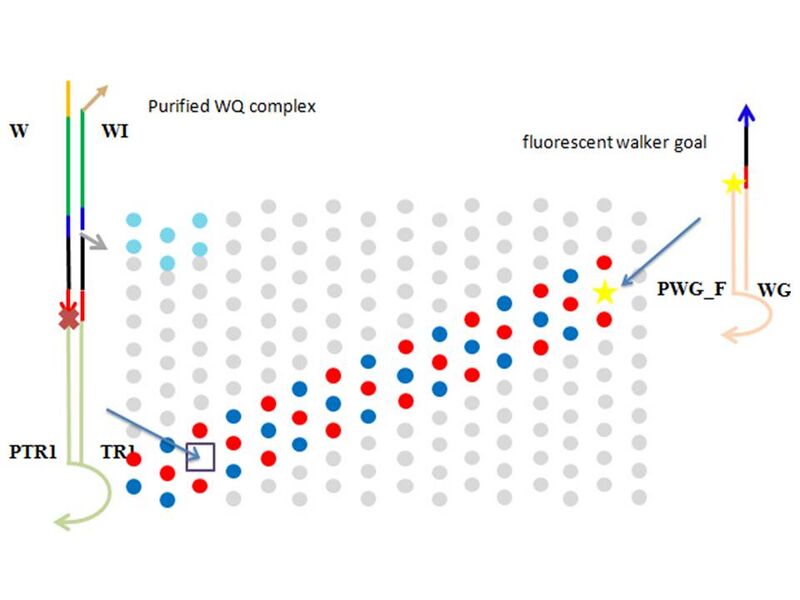 Detection of Potential Leak ReactionsTo verify that the walker walks on the origami using the intended mechanisms, we set up control groups where either tracks (TR), except for the one that the walker is bound to, or walker triggers (WT), or both, were missing in the reactions. Walkers are not expected to perform random walking under such conditions. As shown in Figure 1, no decrease in fluorescent signals were observed unless both tracks and walker triggers were added into the system. Hence potential leak reactions are negligible.