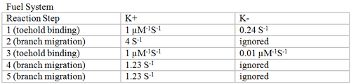 Aside from this part of our system, the reactions present in the other parts of our system have unknown kinetic properties. In particular, the reaction rates around the exchange of two duplexes that occurs in our system have not been modeled to our knowledge. This presents an interesting possibility for studying our system to learn more about the kinetics of these interactions.