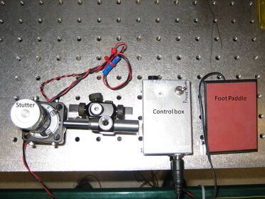 This shutter does it exact and it is fast (activation-time) with an opening time of 4 and closing time of 2 μsec. The shutter runs on a +5 volts voltage. It moves to an on-position with an active voltage (controlled by the toggle foot switch) working against a restore-spring and remains on when the voltage is applied and turns to off when the voltage is removed. This gives a freedom of choice for the duration shutter is active with very simple electronics used to control the speed (activation time.)