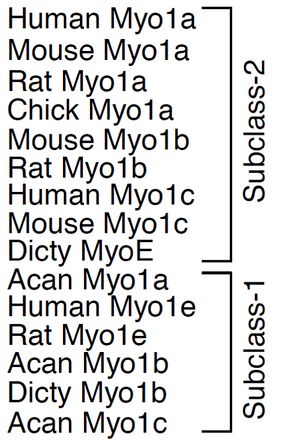 [[Image:myosin1subclasses.jpg|thumb|right|from De La Cruz EM, Ostap EM. January 2004. Current Opinion in Cell Biology 16(1):61-7.]] | [[Image:myosin1subclasses.jpg|thumb|right|from De La Cruz EM, Ostap EM. January 2004. Current Opinion in Cell Biology 16(1):61-7.]] | ||