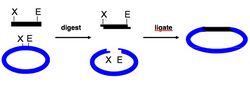 [[Image:Be109transformation.jpg|thumb|right|250px|'''Cloning overview: traditional approach.''' An insert, such as a PCR product, and a backbone, such as a commercially available vector, are depicted in black and blue, respectively. These are digested with the same restriction enzymes (dubbed "X" and "E") so as to have complementary overhangs, and then usually gel-purified. Finally, backbone and insert are joined together to create a new vector using DNA ligase. Note: Figure modified from Prof. Bevin Engelward.]] | |||