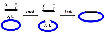 [[Image:20109_cloning-traditional.jpg|thumb|center|400px|'''Cloning overview: traditional approach.''' An insert, such as a PCR product, and a backbone, such as a commercially available vector, are depicted in black and blue, respectively. These are digested with the same restriction enzymes (dubbed "X" and "E") so as to have complementary overhangs, and then usually gel-purified. Finally, backbone and insert are joined together to create a new vector using DNA ligase. Note: Figure modified from Prof. Bevin Engelward.]] | |||