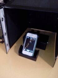 The Single-Drop Fluorimeter consists of a small, simple plastic box with a apparatus situated on the top where the multi-welled slide can fit in and align so that the blue LED shines through a drop placed over two middle wells.